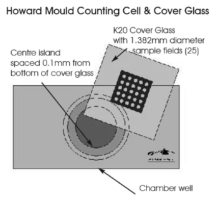 K20這個(gè)蓋片的設(shè)計(jì)很巧妙,35x35mm大小的蓋片中央陳列了25個(gè)直徑為1.382mm的圓形透光區(qū)域,這保證我們觀察一個(gè)區(qū)域時(shí)的視野實(shí)際長度是1.382mm。這也是霉菌計(jì)數(shù)要求的標(biāo)準(zhǔn)視野大小。