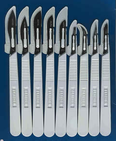 顯微外科解剖刀片,無菌獨(dú)立包裝,共有九種不同樣式,從右往左依次為10、11、12、15、20、21、22、23、24、25號(hào),滿足您不同的實(shí)驗(yàn)操作,訂購時(shí)需要指明幾號(hào)刀片。