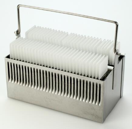 二、玻璃染色缸,配套帶提手的不銹鋼豎式染色架,一個合適的玻璃蓋子。提供有30片裝染色缸和60片裝染色缸套裝。
