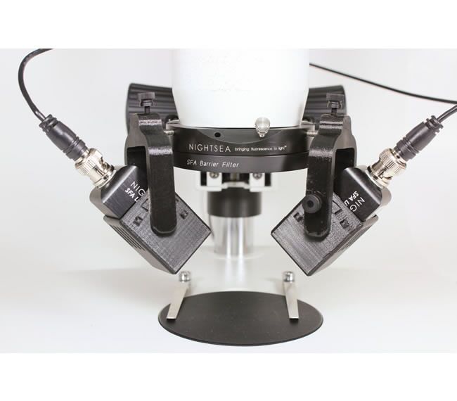 燈使用上可選的配件:燈頭吊架和電纜線。如果覺得鵝頸燈的角度滿足不了自己的需求,可以購(gòu)買吊架和電纜線,吊架可安裝到SFA適配圈上任何一個(gè)螺釘?shù)哪┒恕纛^吊架有兩個(gè)不同的樞軸臂長(zhǎng)度,用于長(zhǎng)和短的工作距離。從鵝頸上移除燈頭,裝入吊架,并將其安裝在SFA適配圈上,用電纜線直接連接燈頭和燈座。其實(shí)可以一個(gè)燈座連接雙線電纜,安裝兩個(gè)燈頭和兩個(gè)吊架,你就有雙倍的激發(fā)強(qiáng)度。